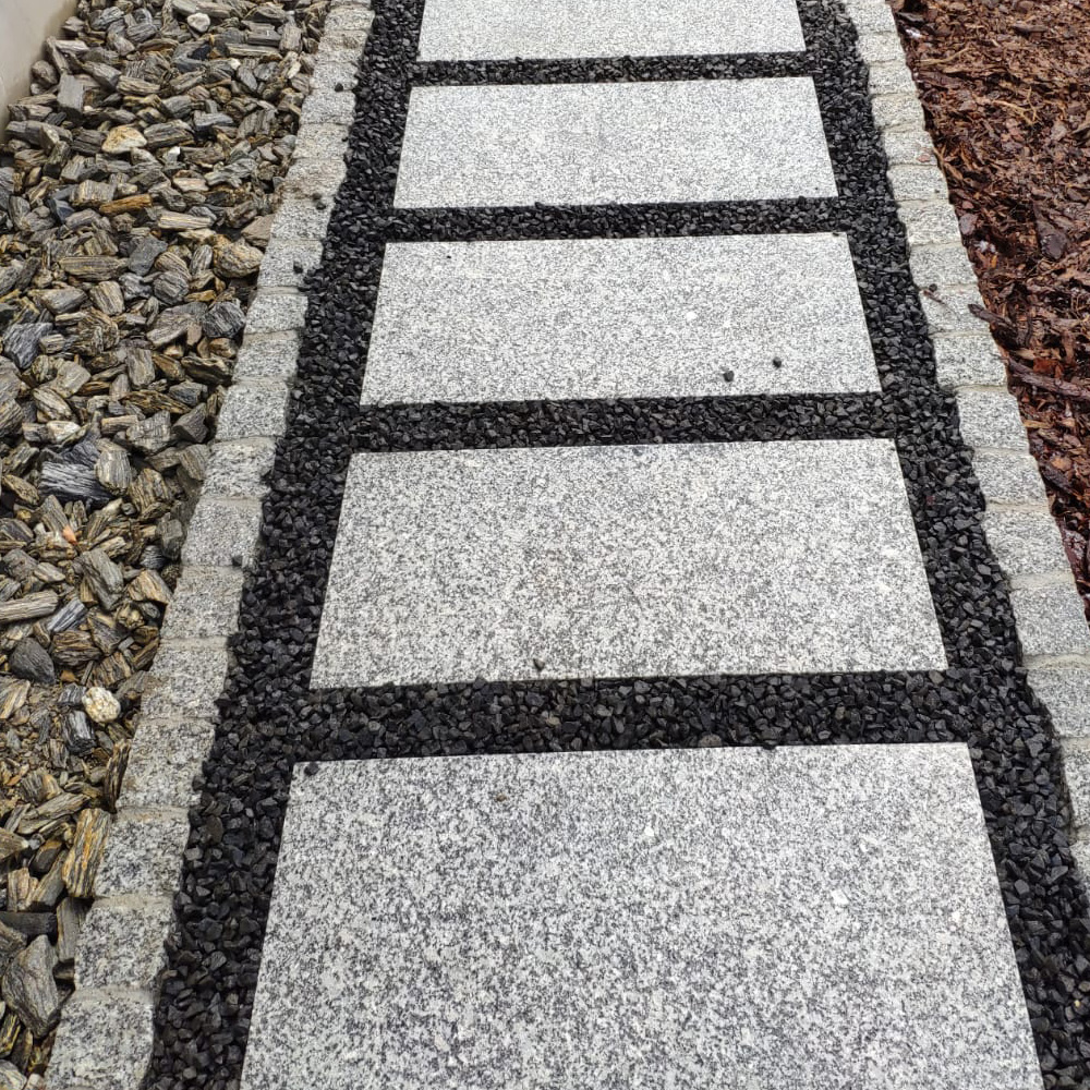 Płyty granitowe płomieniowane – Płomieniowanie powoduje, że powierzchnia płyt granitowej staje się chropowata, a dzięki temu antypoślizgowa. Takie płyty świetnie nadają się do zastosowania na zewnątrz budynków. Płyty granitowe płomieniowane bardzo dobrze spisują się jako płyty chodnikowe, płyty tarasowe, płyty ogrodowe czy schody.